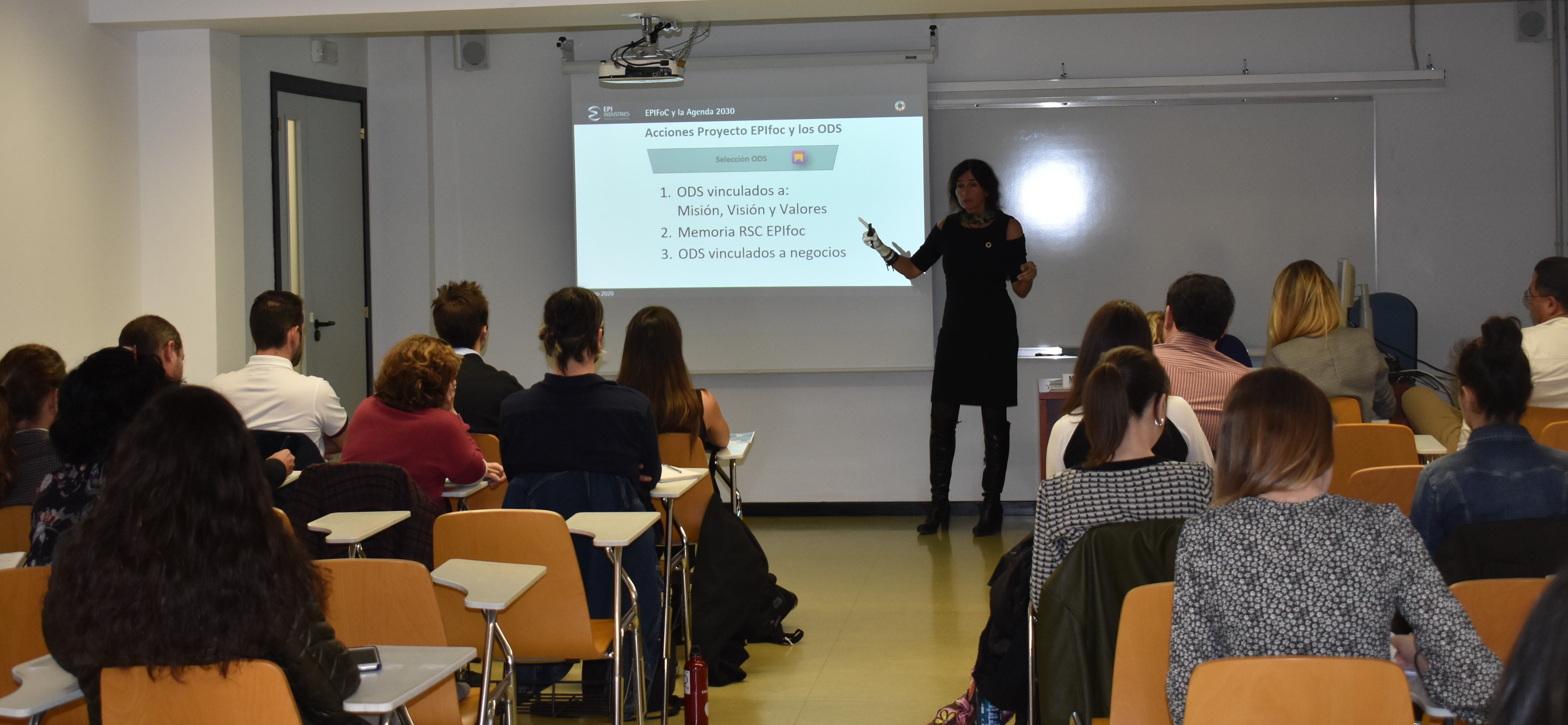 La ponente ha expresado que la Universidad está implementando los 17 Objetivos de Desarrollo Sostenible a partir de diferentes ejes de acción, que van desde fomentar la integración de alumnado con capacidades funcionales diversas a impulsar la economía social y colaborativa a partir de diferentes proyectos, foros, asignaturas y temáticas para Trabajos de fin de Grado o Máster.