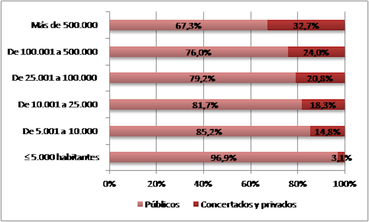 Así, mientras en los municipios de más de 500 000 habitantes los concertados y privados suponen casi la tercera parte del total de los centros y en los de entre 100 000 y 500 000 habitantes la cuarta parte, en los municipios que, por ejemplo, cuentan con 5 000 o menos habitantes su presencia es testimonial (3 %). Municipios, estos últimos, que, no obstante, suponen el 84 % de los más de 8 000 que hay en toda España y en los que viven más de cinco millones y medio de personas, según los datos del INE.